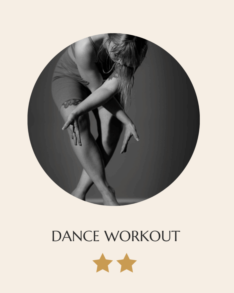 Dance Workout on rytmillinen, musiikin tahtiin tapahtuva kevyempi lihaskuntoharjoitus. Harjoitus kehittää peruskunto sykkeillä tapahtuvaa kestävyyttää.
