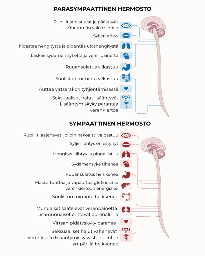 ⚡Sympaattinen hermosto: valmistaa elimistön toimintaan ja stressiin (fight or flight).
